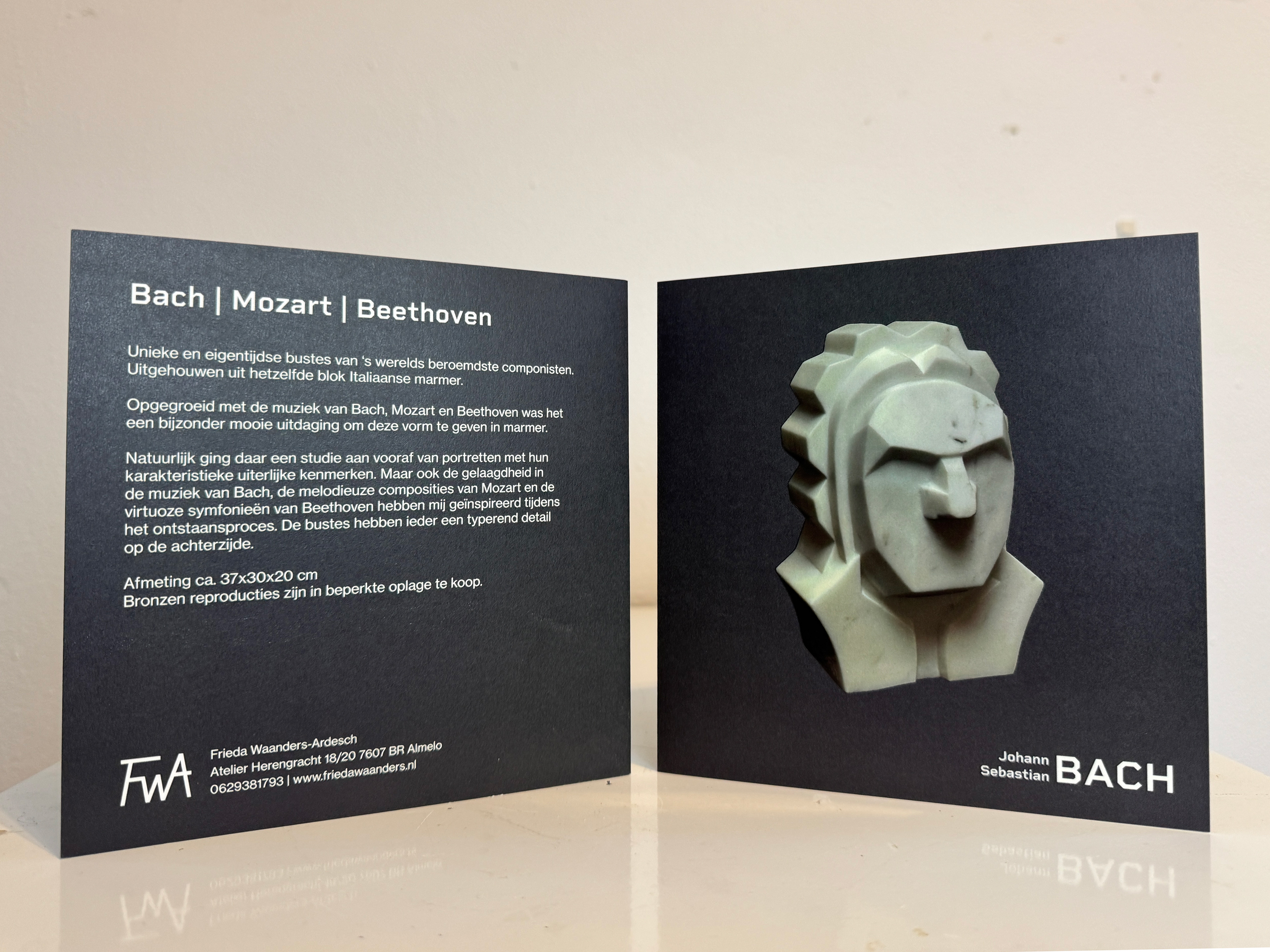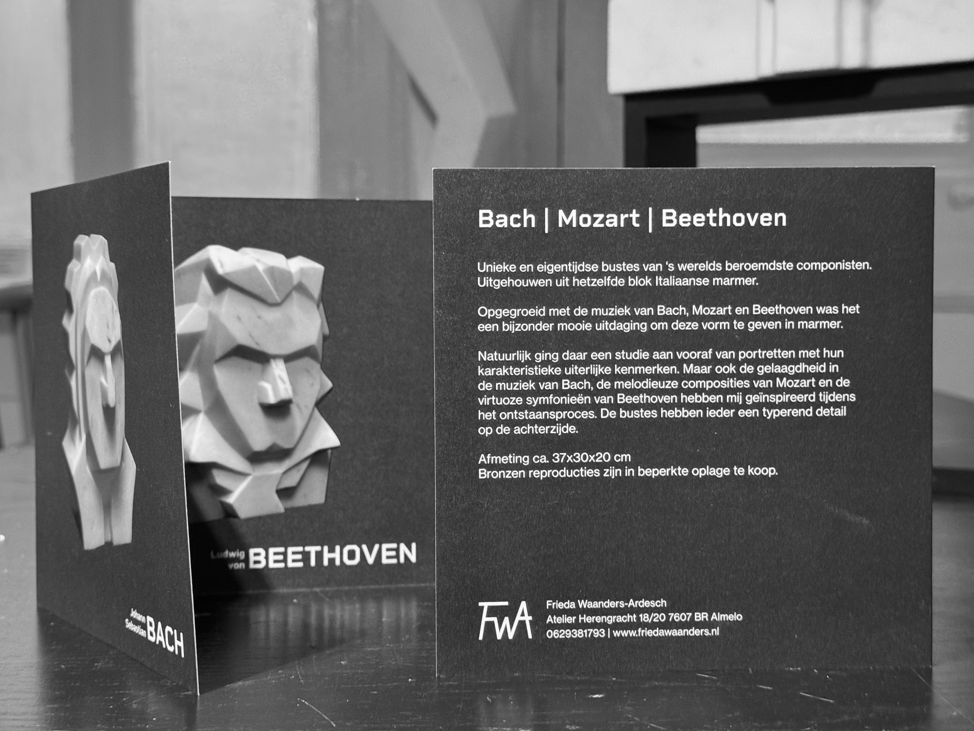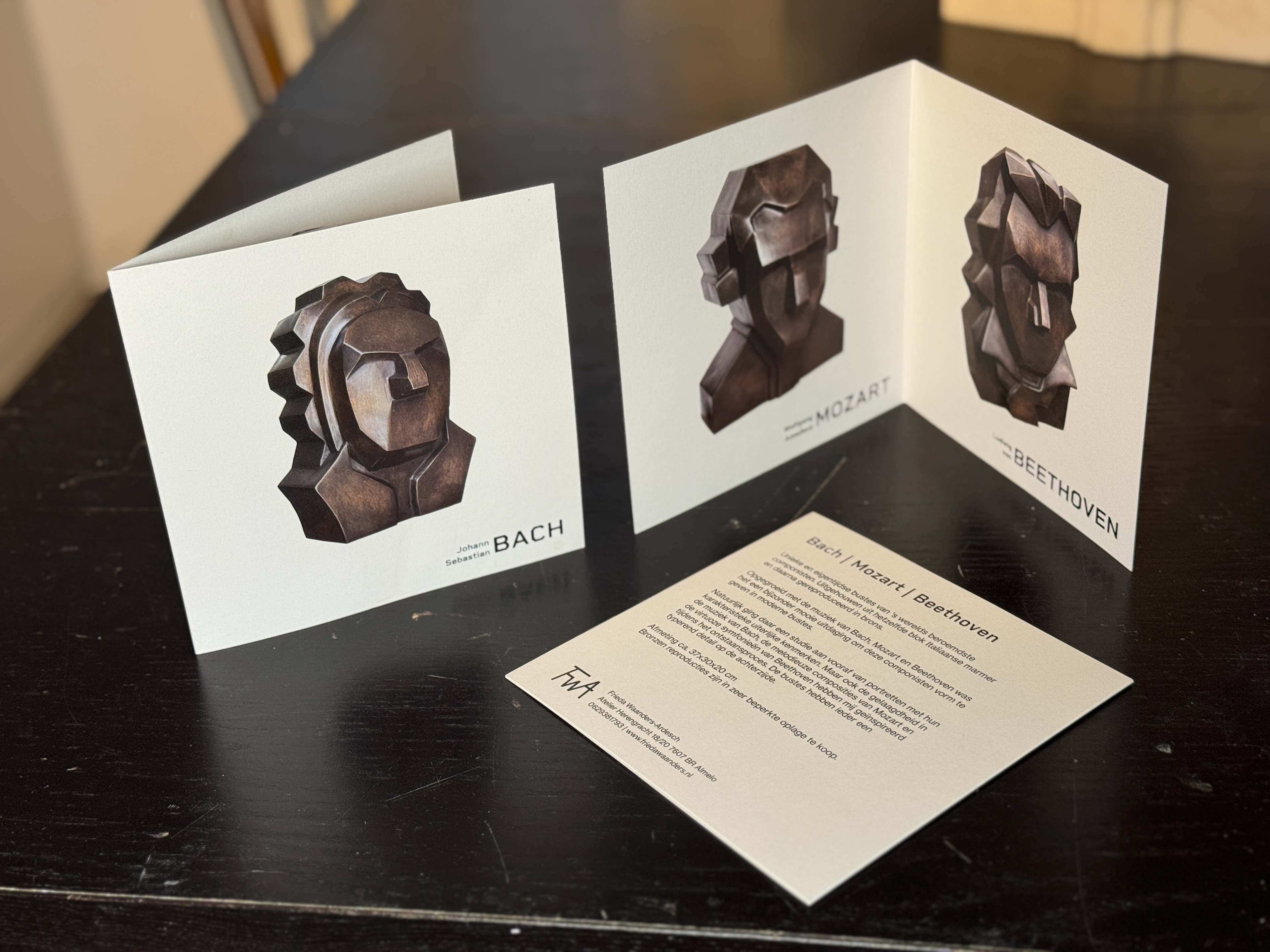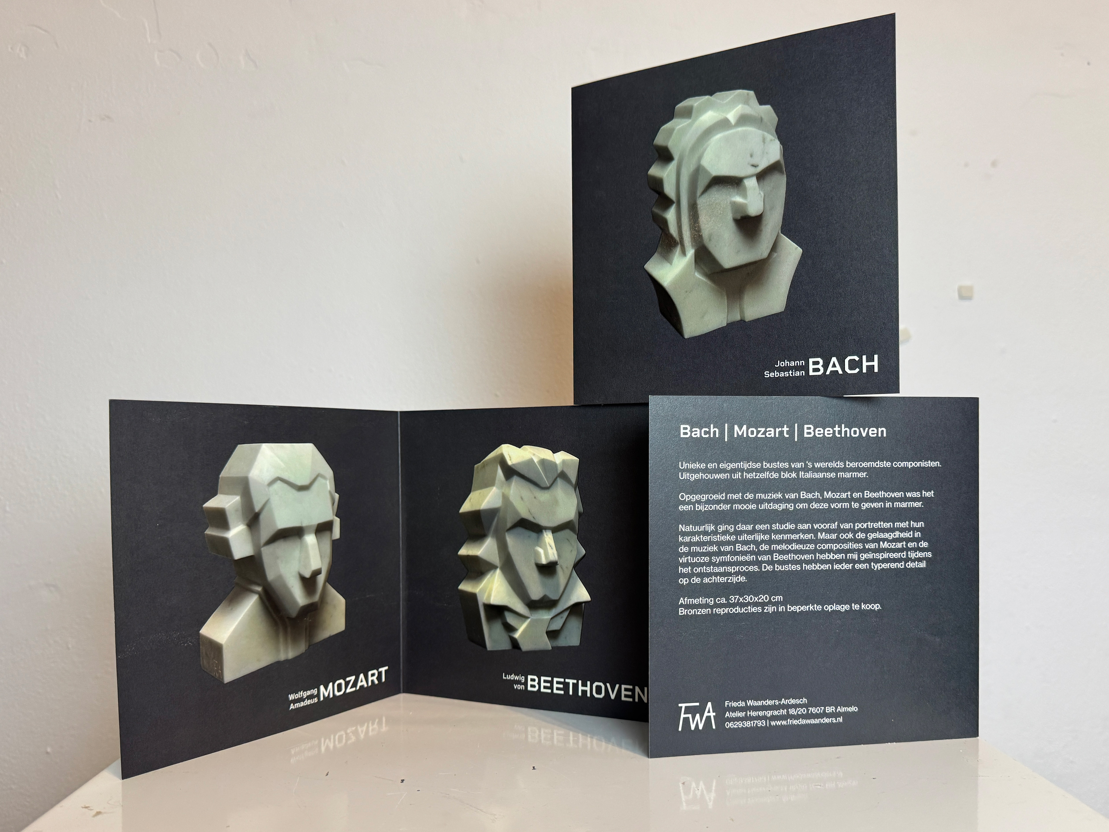 Voor beeldhouwster Frieda Waanders-Ardesch ontwierp ik een kaart/folder voor de tentoonstelling van haar marmeren bustes van Bach, Mozart en Beethoven. De drie beelden worden ieder op een eigen kant weergegeven, met op de achterkant een korte begeleidende tekst voor bezoekers.