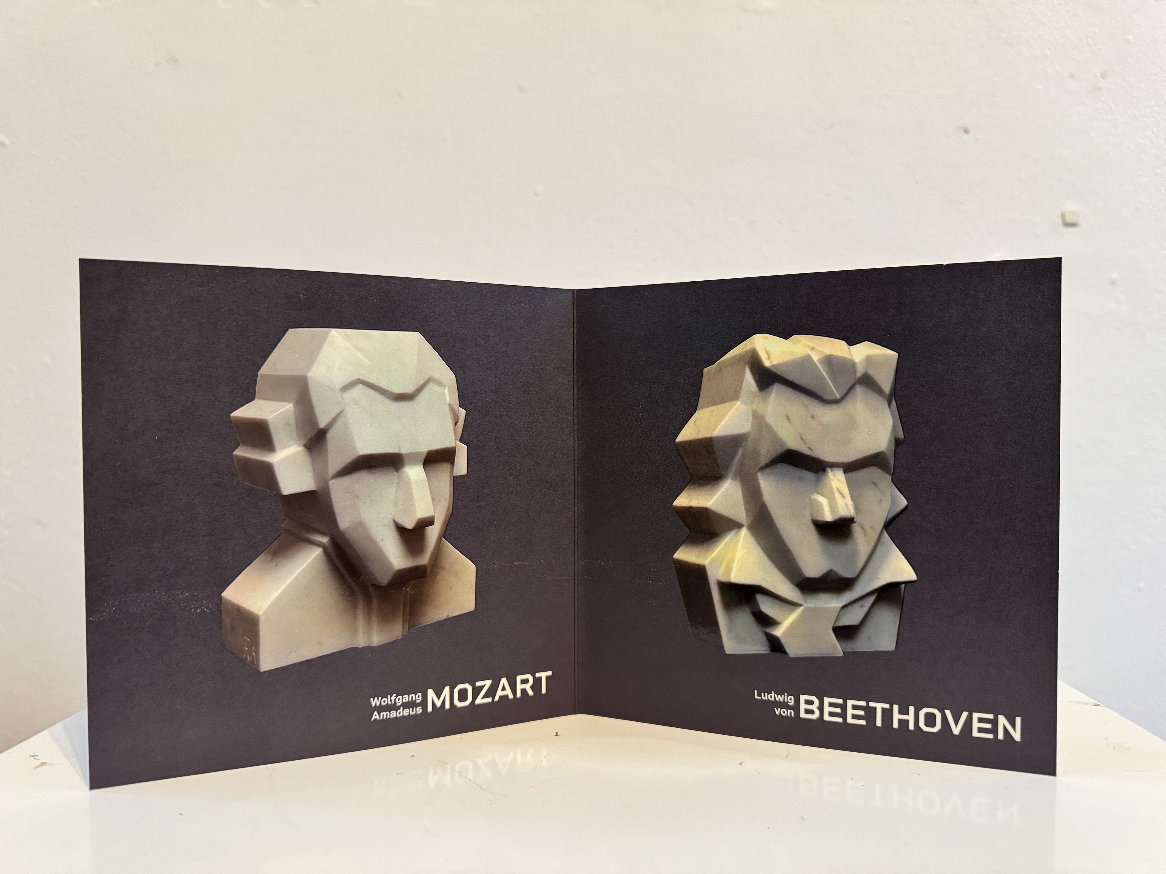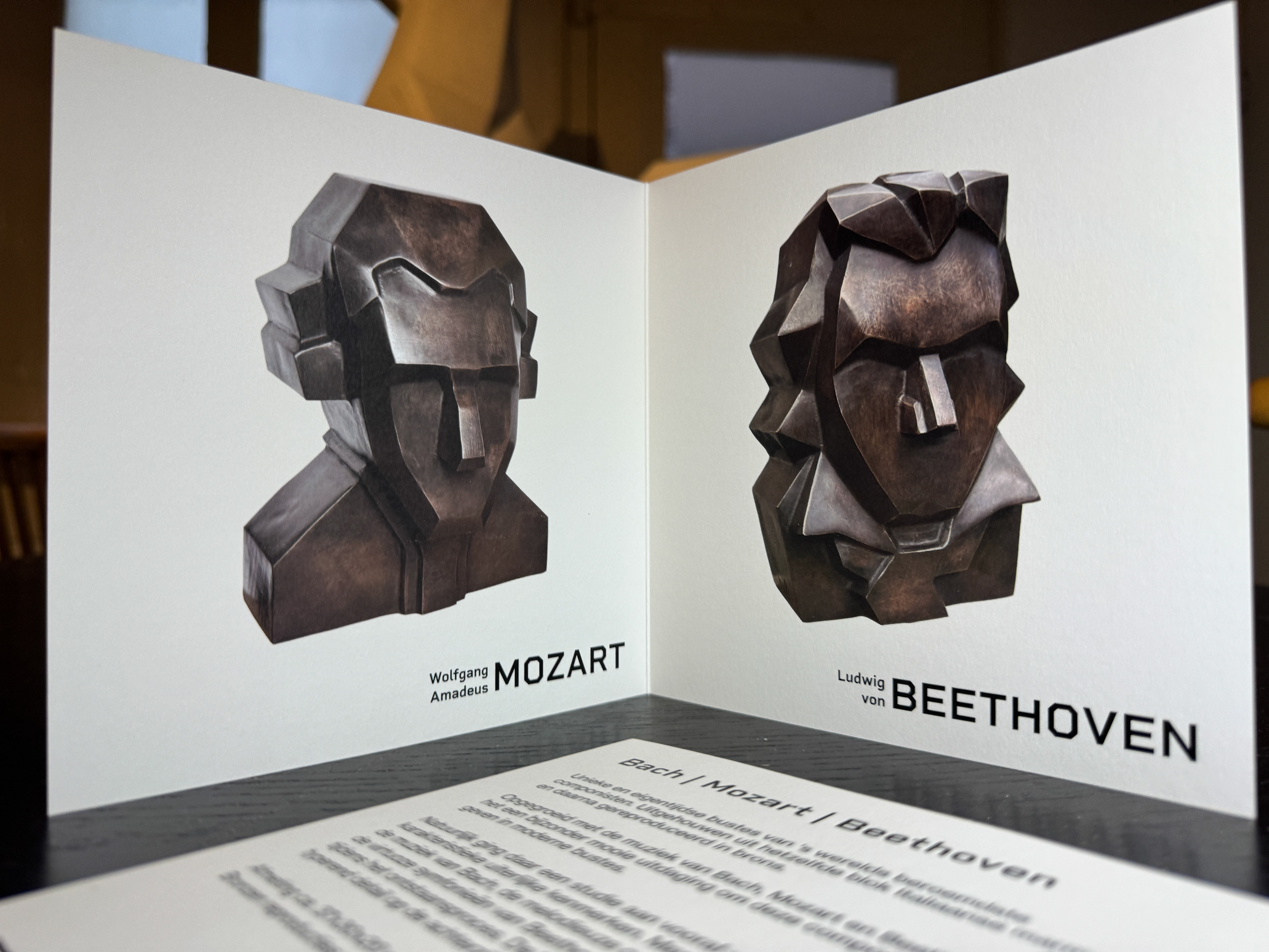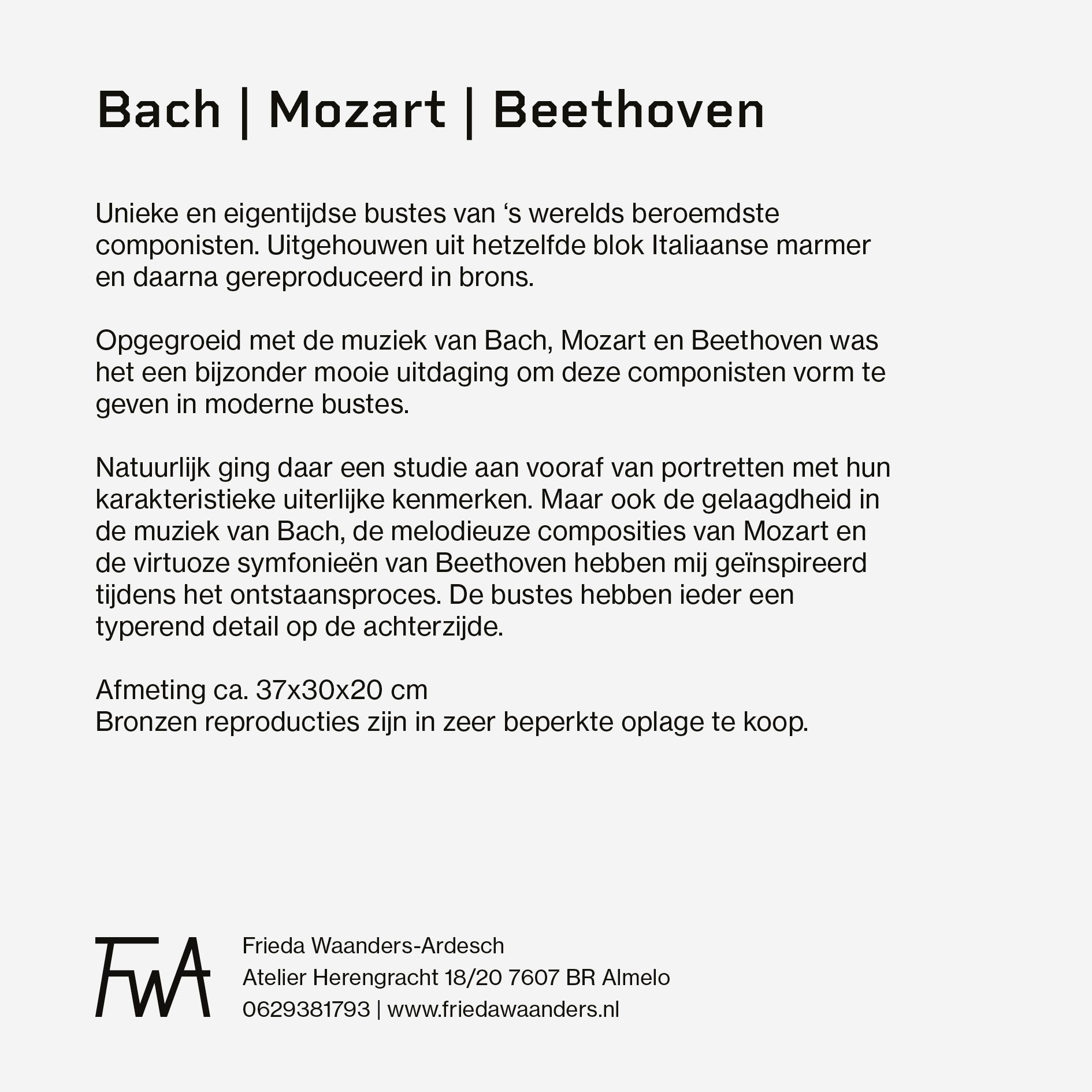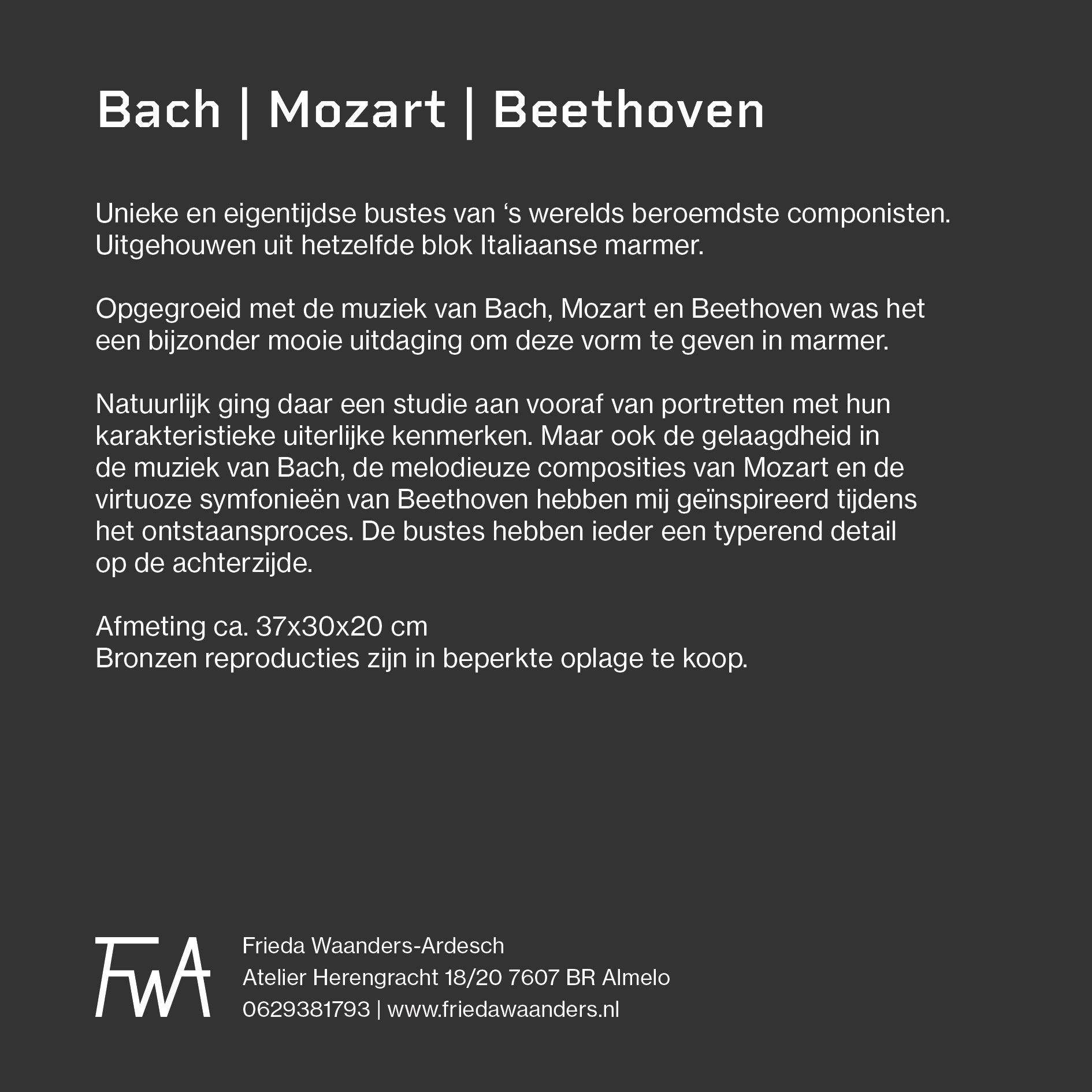 Voor beeldhouwster Frieda Waanders-Ardesch ontwierp ik een kaart/folder voor de tentoonstelling van haar marmeren bustes van Bach, Mozart en Beethoven. De drie beelden worden ieder op een eigen kant weergegeven, met op de achterkant een korte begeleidende tekst voor bezoekers.